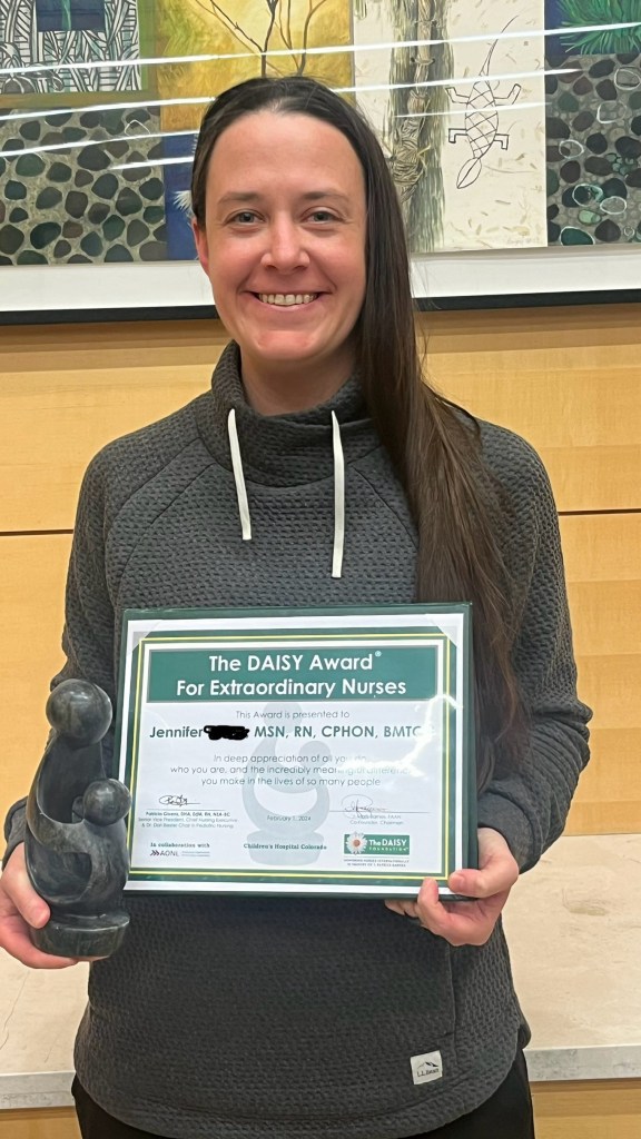 Sometime last May I formally nominated one of Luke’s nurses for The Daisy Award. There are MANY nurses that went above and beyond and continue to as we go in for weekly visits. I could write a chapter about so many of them! I could have easily nominated SO MANY. But this one is for Jen. I won’t go into the private and painful details of the times when Jen figured out a complicated puzzles involving Luke’s journey. She is an amazing critical thinker and never gave up. The Daisy award is a prestigious international award for nurses. To be honest, I had forgotten about it, considering how long ago it has been since writing her nomination. Last week I received an email from the Daisy award coordinator/Professional Development Department at Children’s Hospital CO. They informed me that Jen had indeed won the Daisy Award and asked if I would be willing to be a part of the surprise ceremony and read her nomination. Luke and I had to keep it a secret for a week but today we joined (via zoom) and got to be a part of it. Cue the tears of joy. A total of 5 nurses received the award today. The stories of the other 4 nurses and the families involved were incredible. HELLZZZZ YAH! What a gift for Luke and I to be a part of it! AND, Jen had ZERO clue what was happening today until she walked into the room where the ceremony was held.